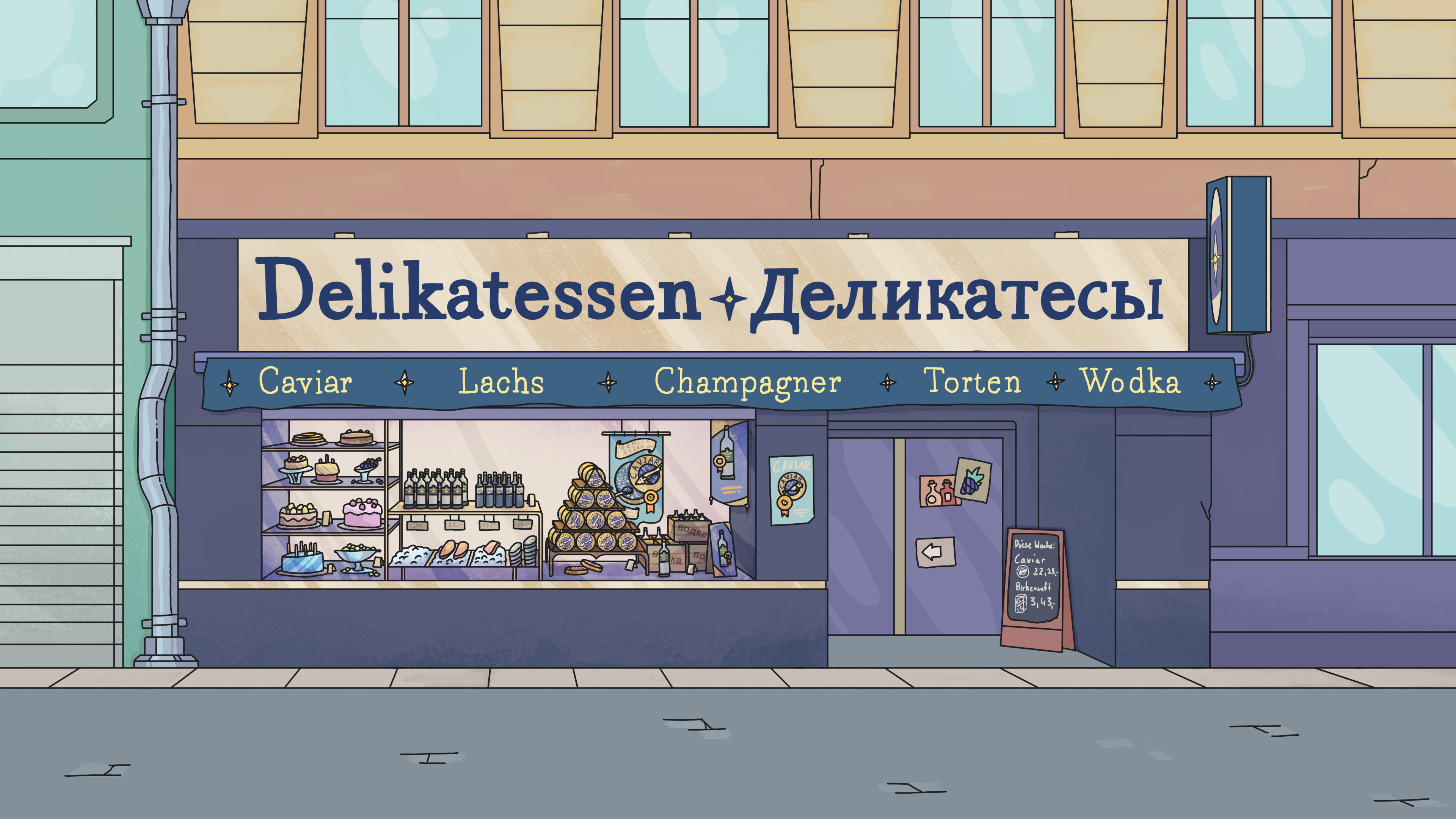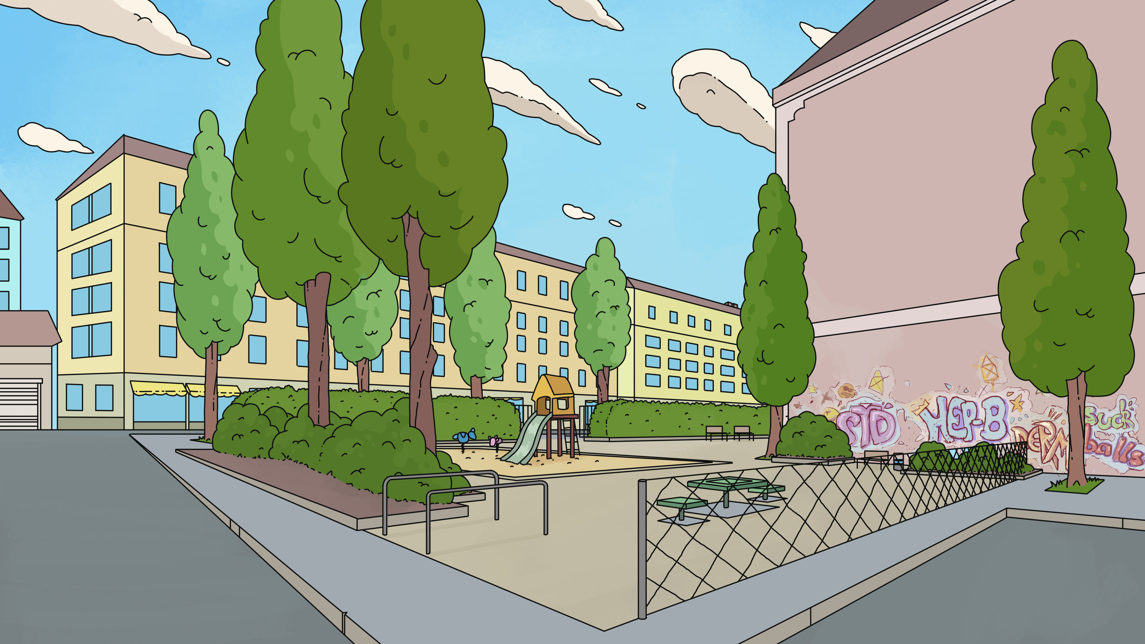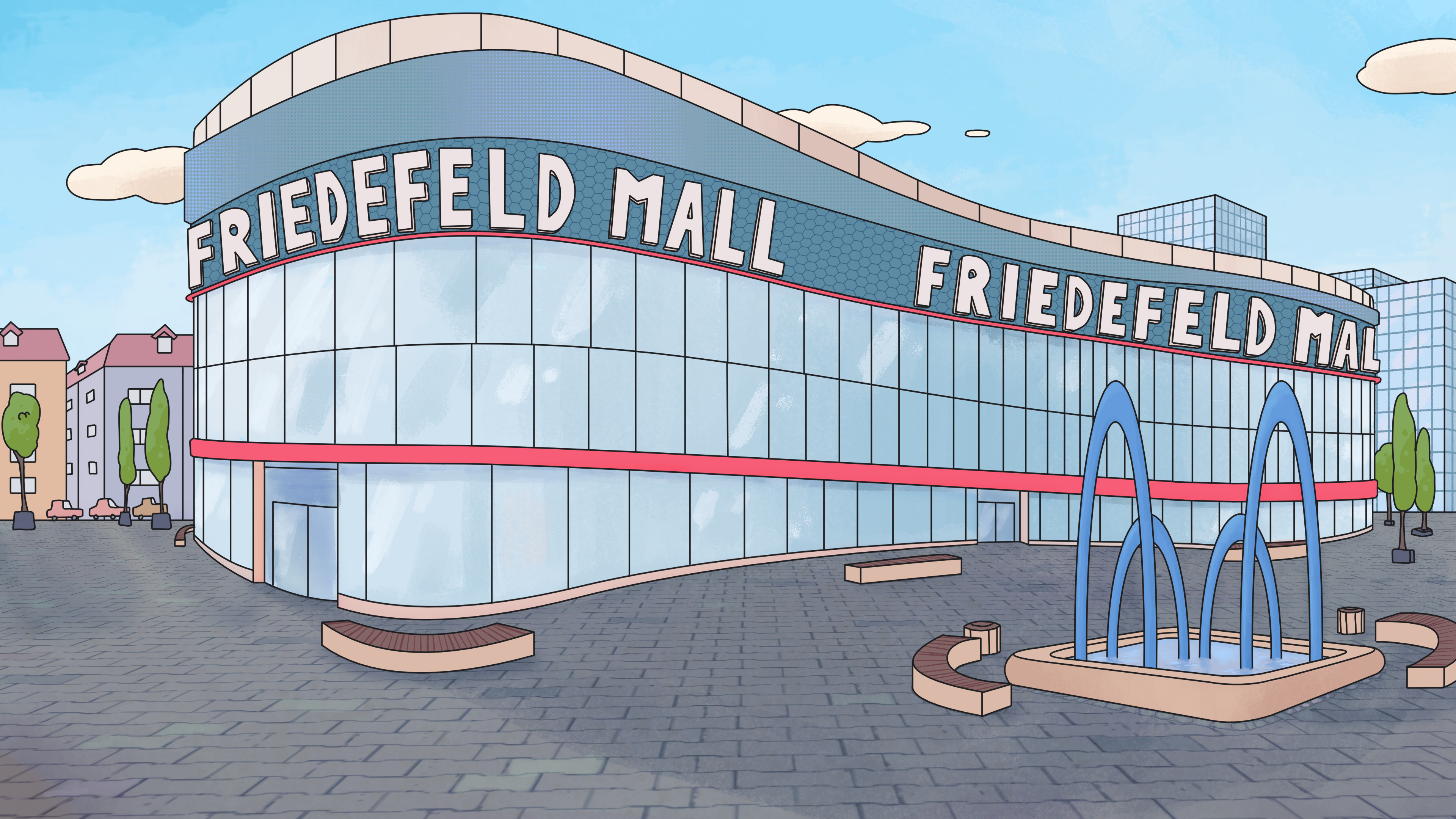 Für die animierte Sitcom Serie: Friedefeld (erschienen am 22. März 2024 auf BR Fernsehen & ARD Mediathek) erstellte ich insgesamt circa 30 Set Hintergründe.